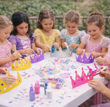 A guided craft activity where each child decorates their own paper crown using stickers, glitter, and fun accessories, and takes it home as a keepsake.Two specialized party hosts