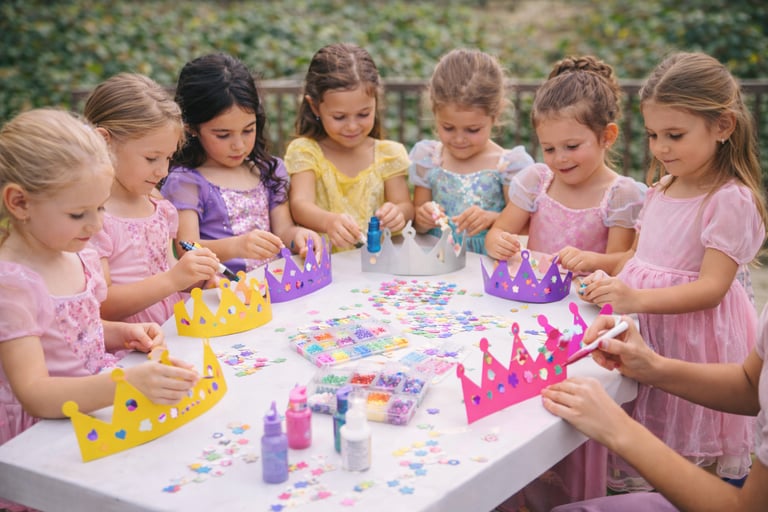 Age-appropriate makeup, applied gently, with soft colors and a touch of sparkle. Always safe and kid-friendly.Crown decorating workshop